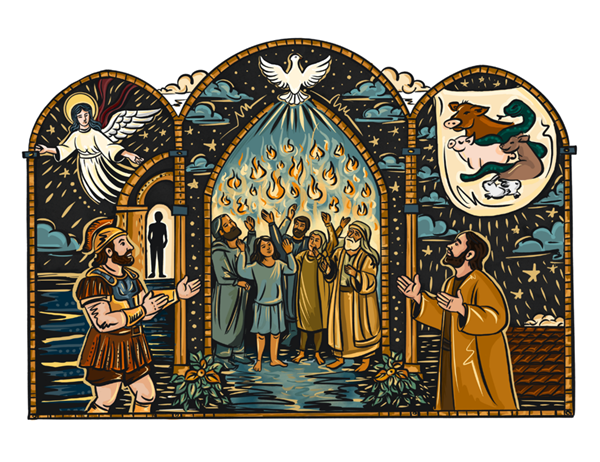 On the left, Cornelius, a Roman centurion, prays and receives a vision from God, highlighting his faith and generosity as a Gentile. On the right, Peter has a challenging vision of unclean animals, which questions his beliefs about purity and inclusion. At the center, an open doorway symbolizes the Kingdom of God, where the Holy Spirit descends on both Jews and Gentiles.