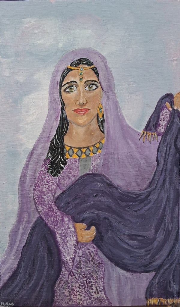 In my painting, I portray her in purple, holding her cloth, framed in the same royal hue. By connecting with influential people through her trade, Lydia bridged the gap between wealth and faith, using her resources to serve God and support His mission. By painting Lydia's facial features, I intended to honor her as a real, living woman rather than a distant figure in Scripture. In her eyes and in her particular expression, I invite viewers to see Lydia as a faithful servant of God, whose open heart and generous spirit reveal the quiet strength of a woman touched by grace, and not just as “the woman who sold purple.” She remains an inspiring role model for women in the church today.