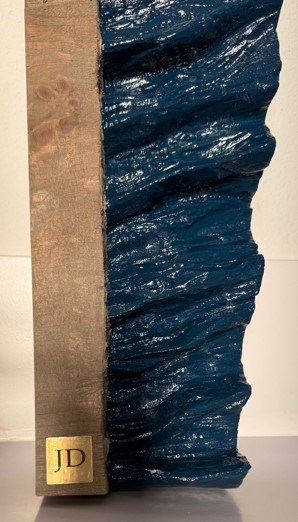 The pine block was harvested from the damage of a tornado: itself redeemed from devastation to art. I used a set of hand chisels to achieve the curves and edges of the waves. Once coated in a single shade of deep blue and covered in polyurethane, the waves catch the light and become a living sculpture. The rough edges were stained for uniformity and left to look weathered.