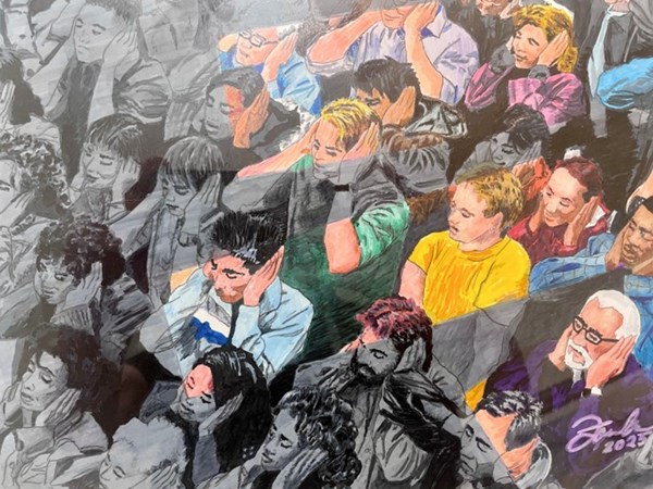 This artwork depicts people in the dark. When light is revealed upon them, they have a choice to make – either have the will to uncover their ears and change their heart – or remain as they are. Think about the warmth of the light on your skin versus the cold that runs through your bones in the dark. That warmth of the Spirit may be the only thing that gets you to change your stubborn mind.